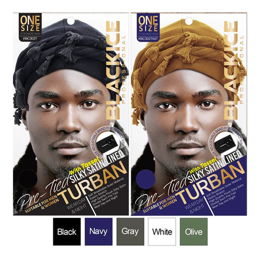 BLACKICE Pre-Tied Color: Black Silky Satin Lined Turban with Tassel