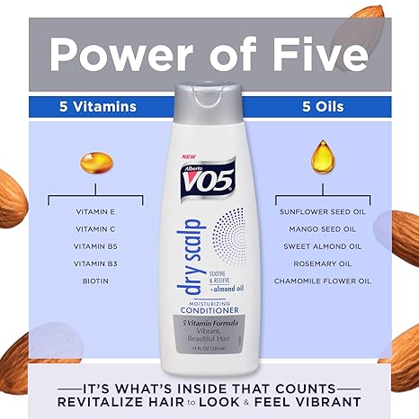 Say goodbye to your dry scalp. VO5 Dry Scalp Moisturizing Shampoo and Conditioner plus Almond Oil helps soothe and relieve dryness with its special moisturizing formula.